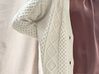 a woman wears a beige coloured cashmere aran cardigan sweater with horn buttons on it and diamond stitches