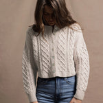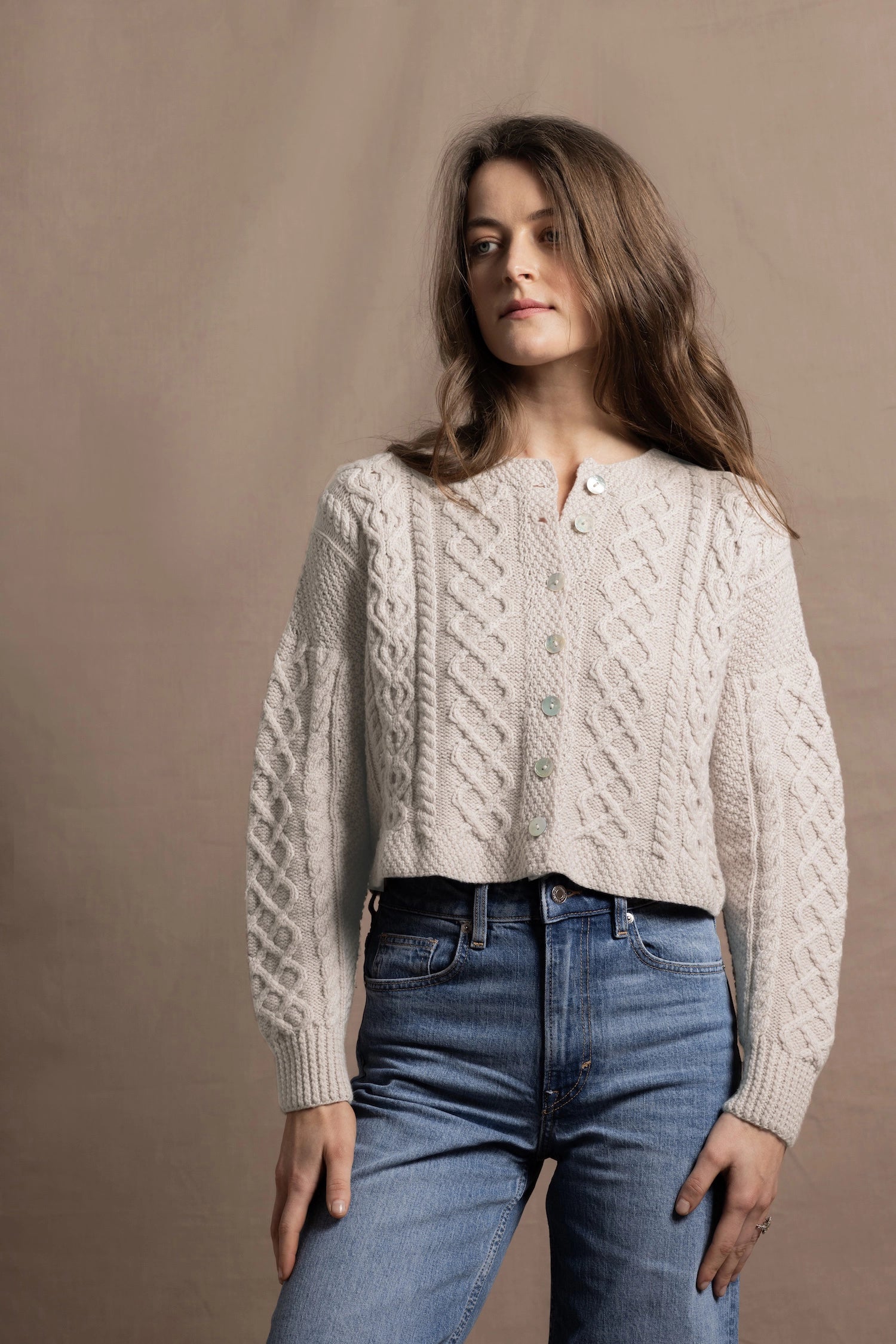 The hand knitted Róisín Cashmere Aran Cardigan makes beautiful use of the traditional stitches & tells a story of success and good fortune.