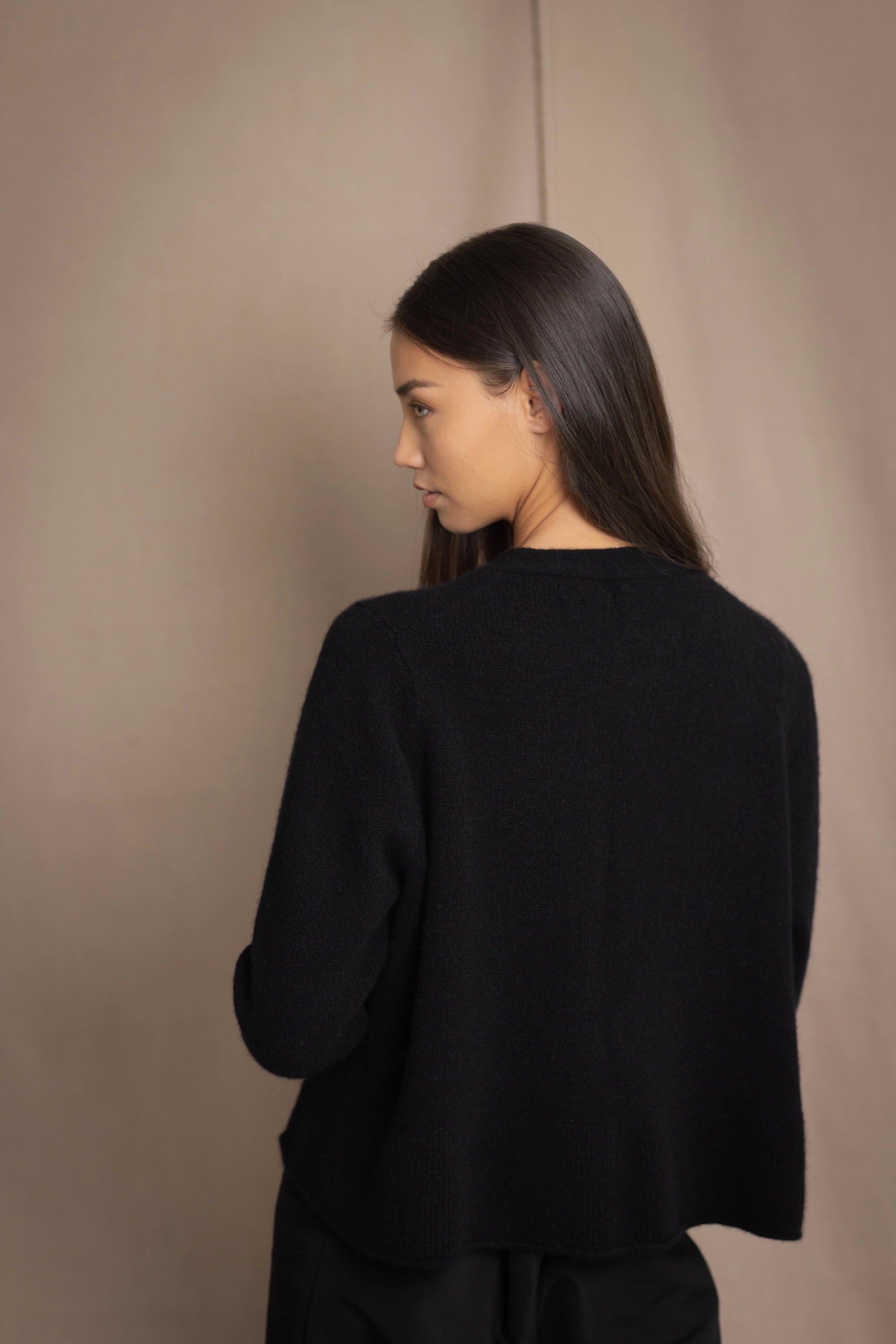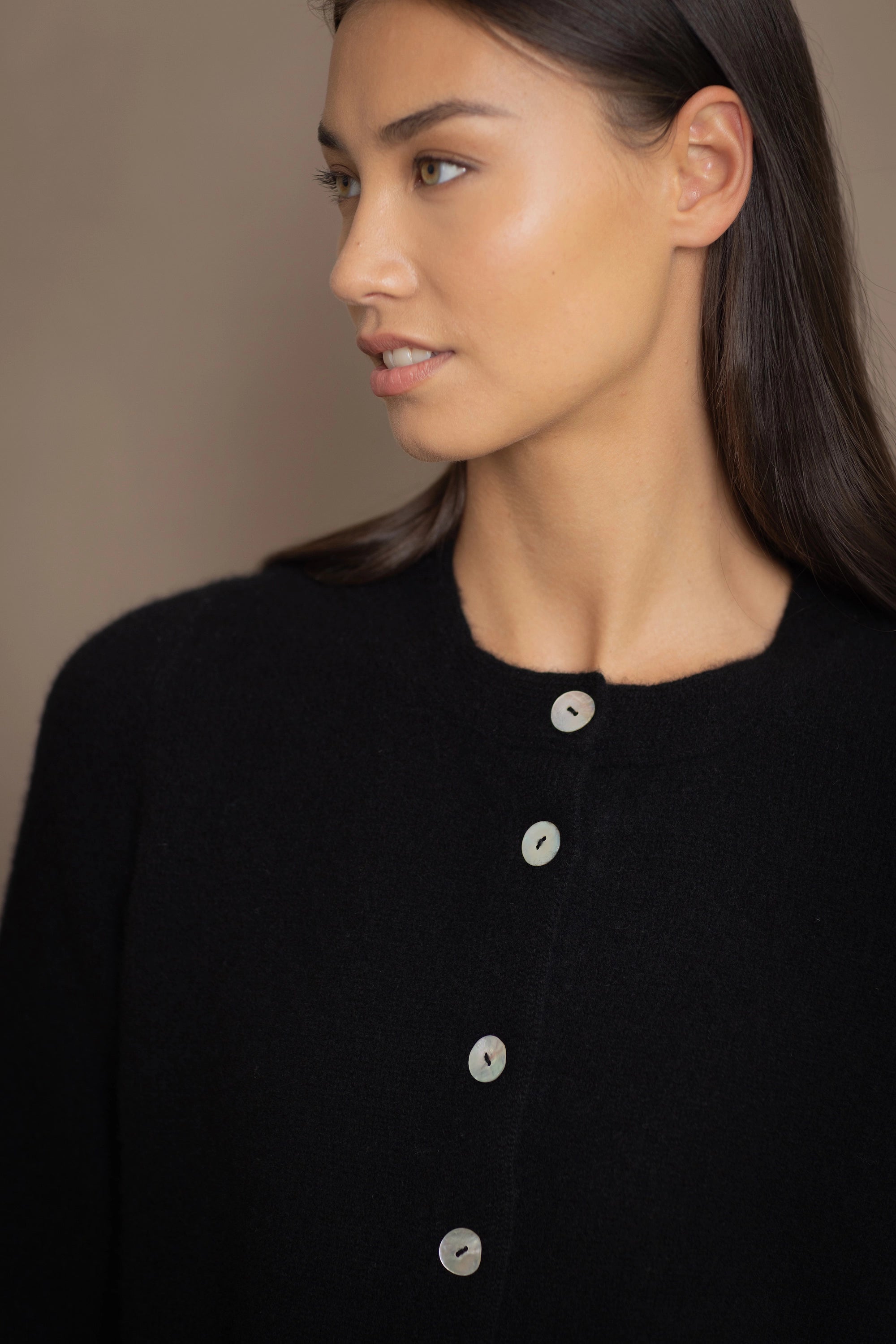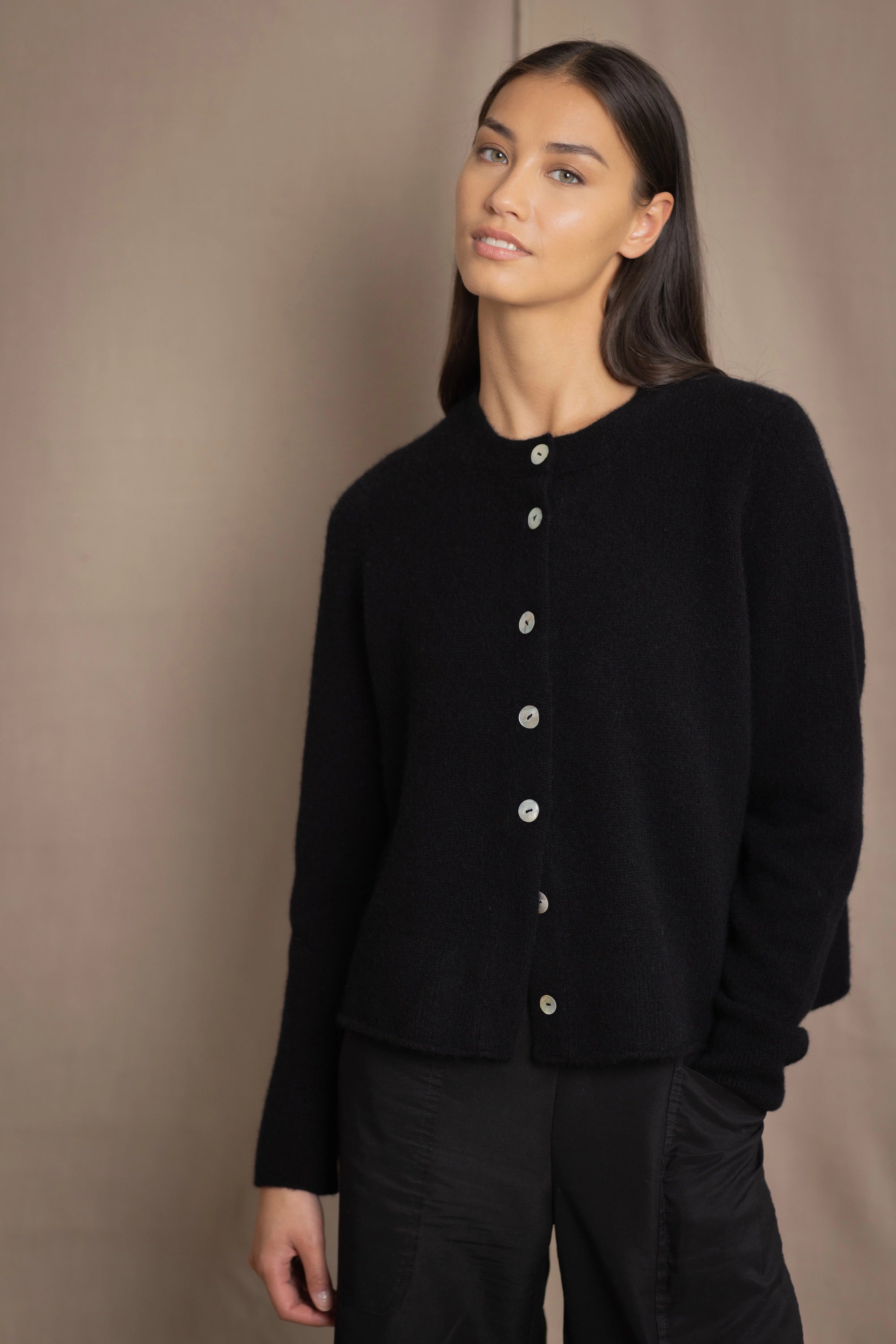 a woman wears a cashmere button down cardigan in black
