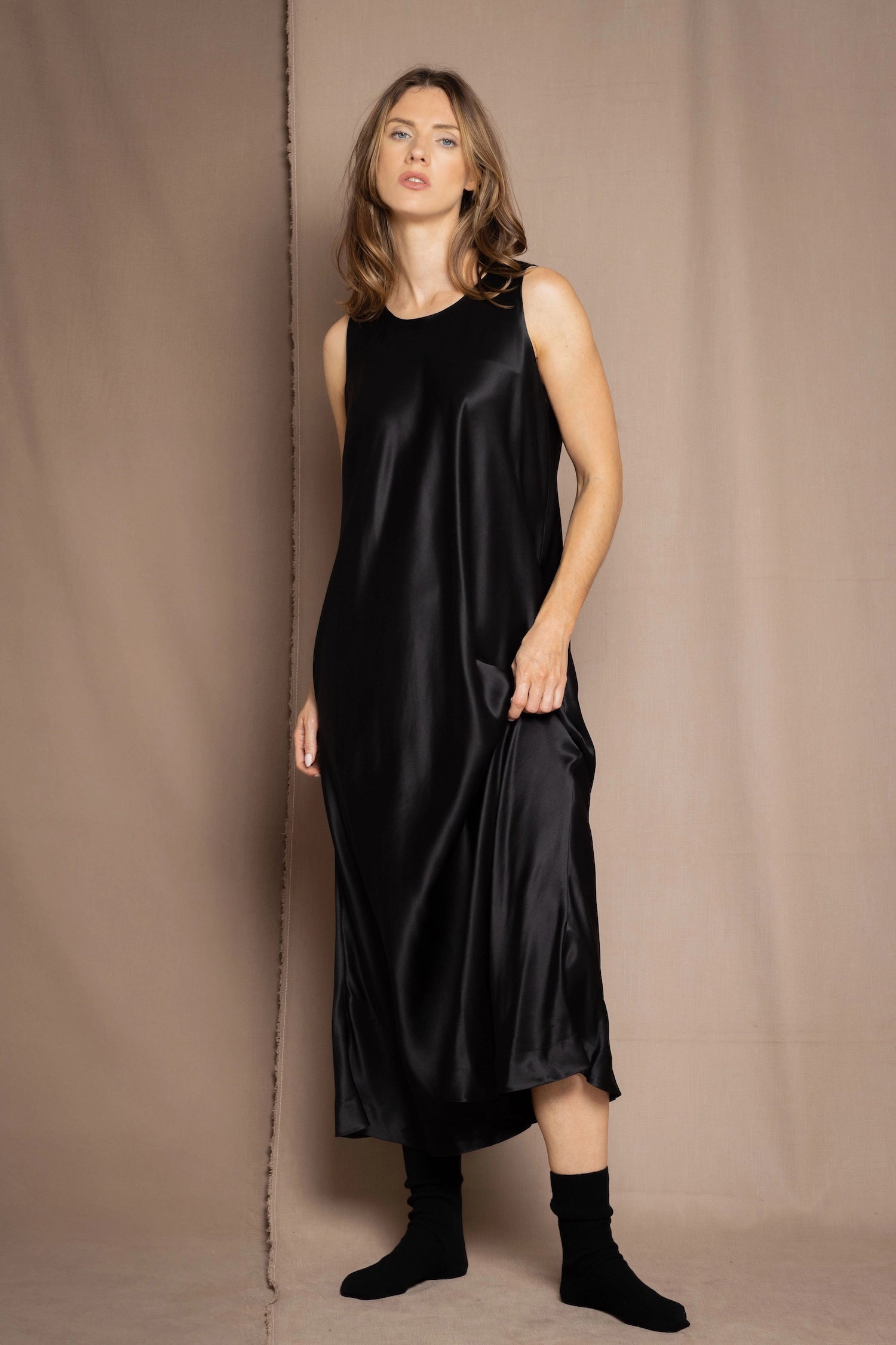 Each garment is handmade in Ireland. Cut on the bias to give an elegant drape, each piece skims the body in a way that is both flattering and comfortable to wear.