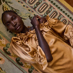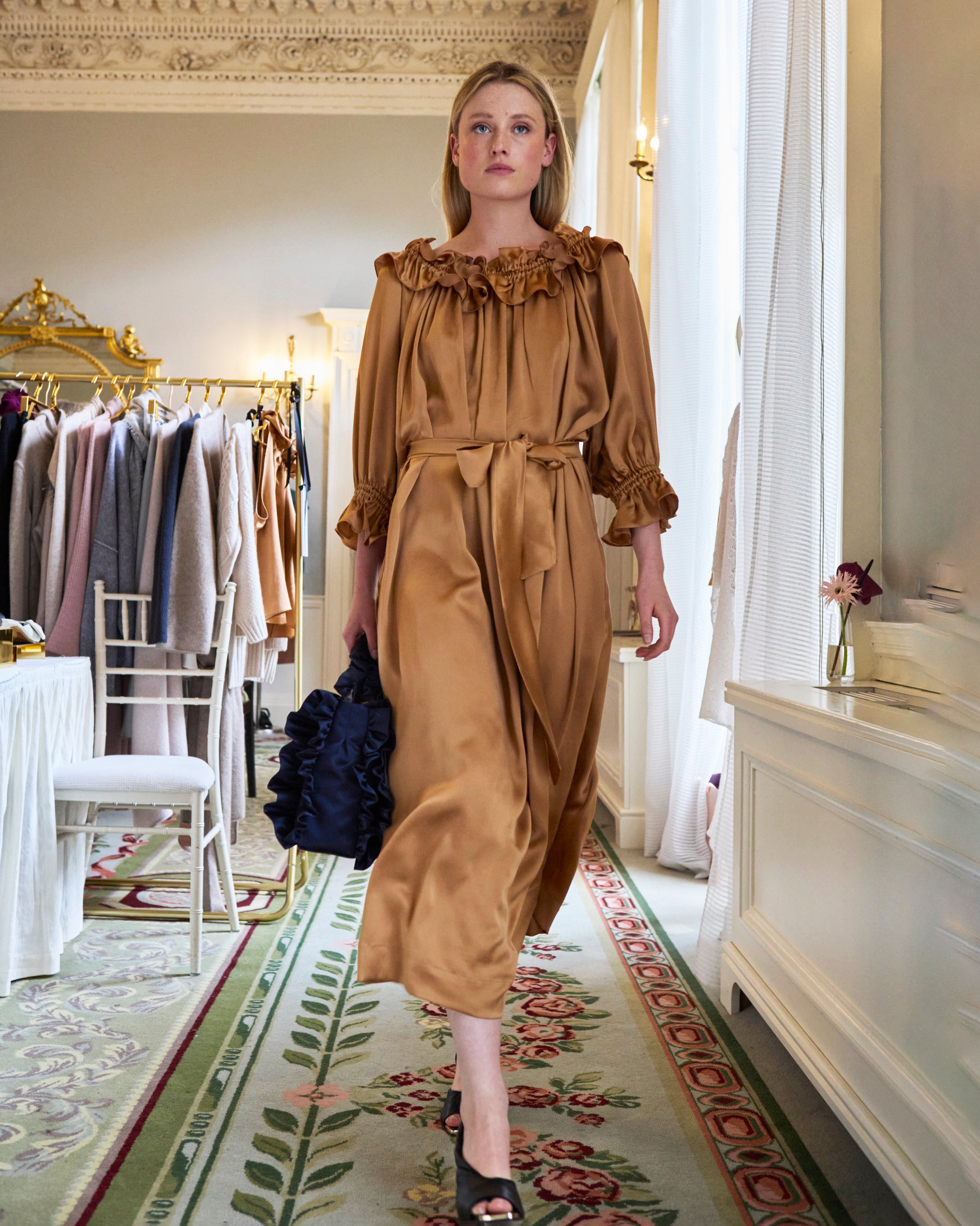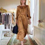 Framed by dramatic frill detailing along the sleeves and neckline, the dress exudes timeless charm, while its elasticated neckline offers versatile styling, worn elegantly off the shoulder or softly gathered in place. Thoughtfully designed with discreet pockets, it balances luxury with practicality. A silk belt allows the waist to be cinched for definition, or left loose for a more relaxed silhouette.