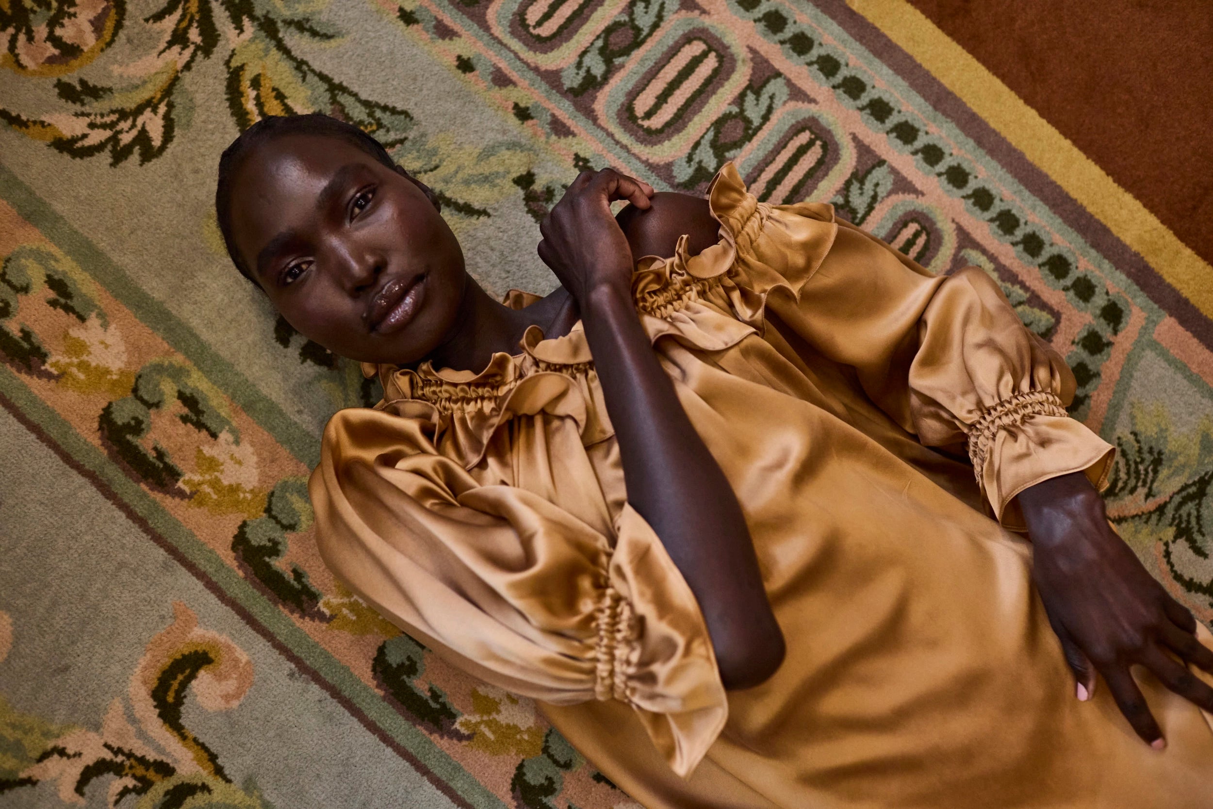 Woman in a bronze silk dress posing