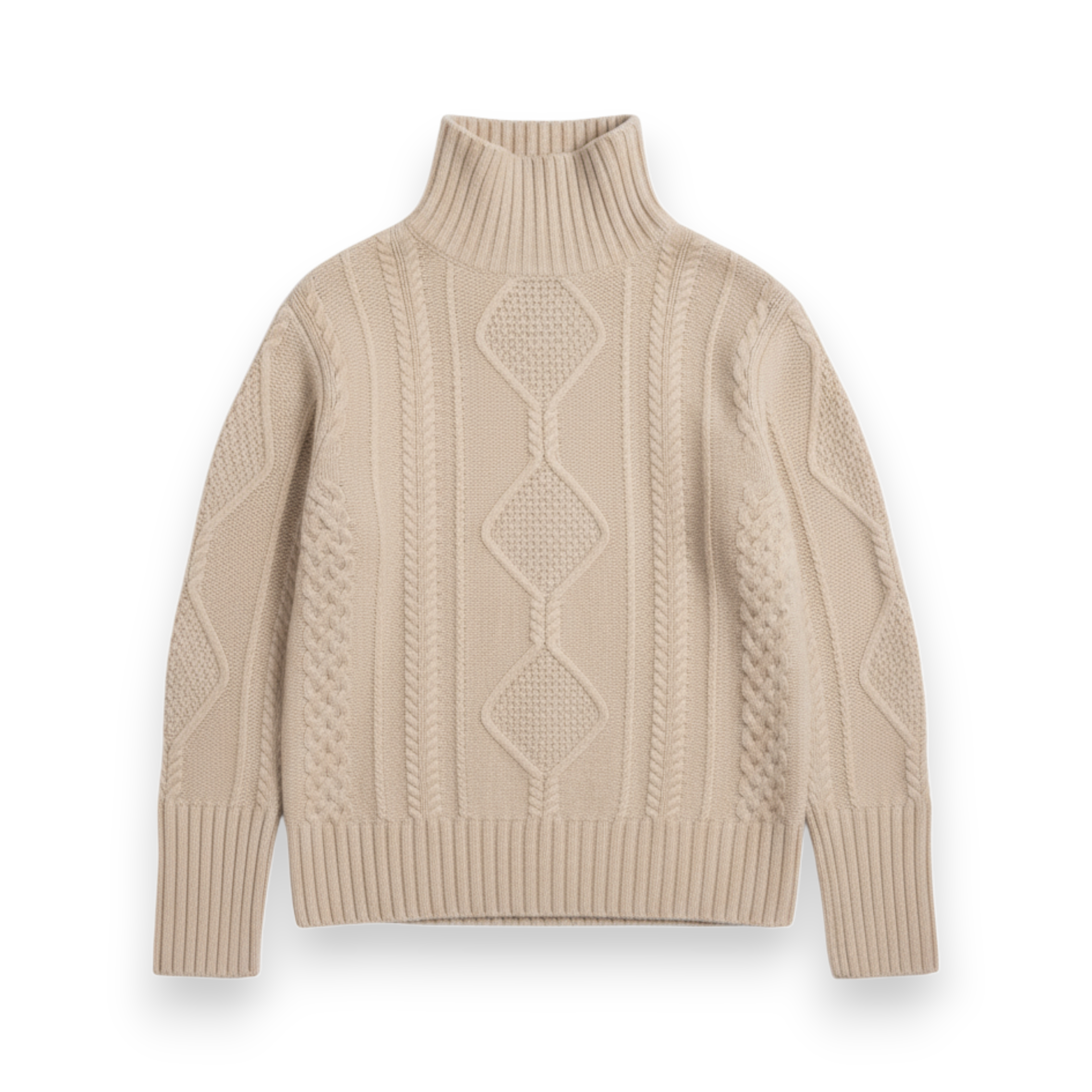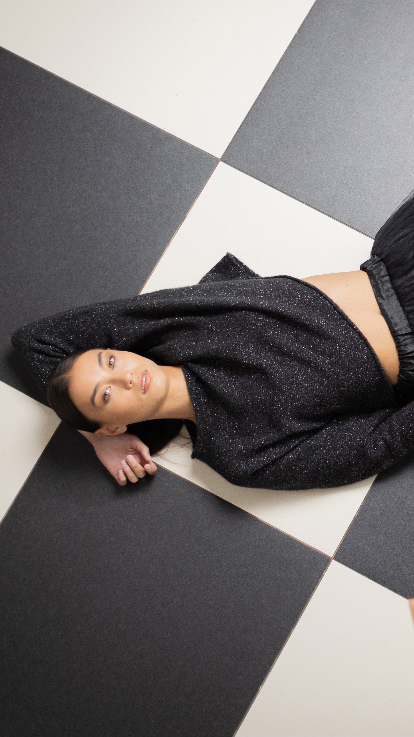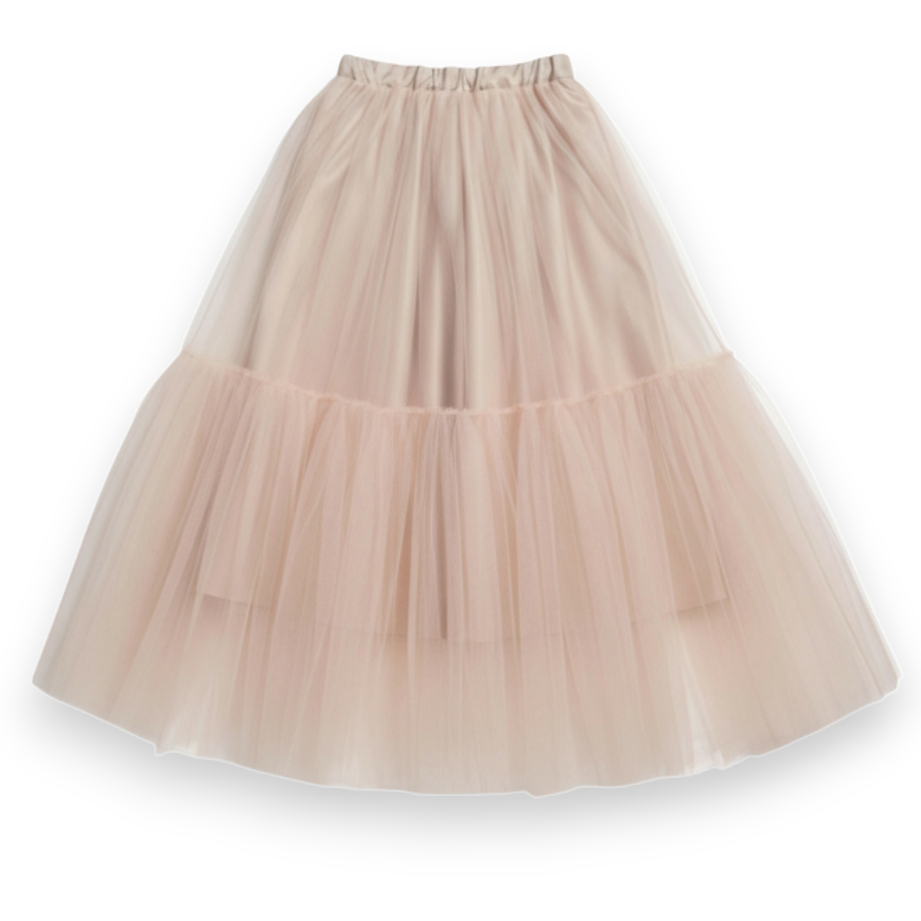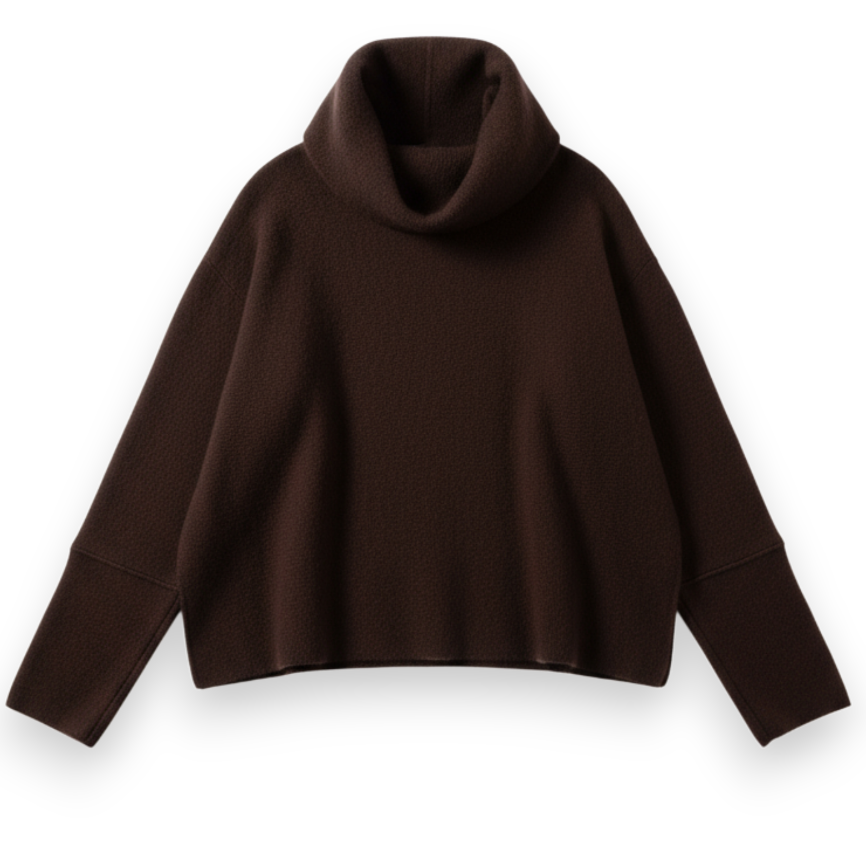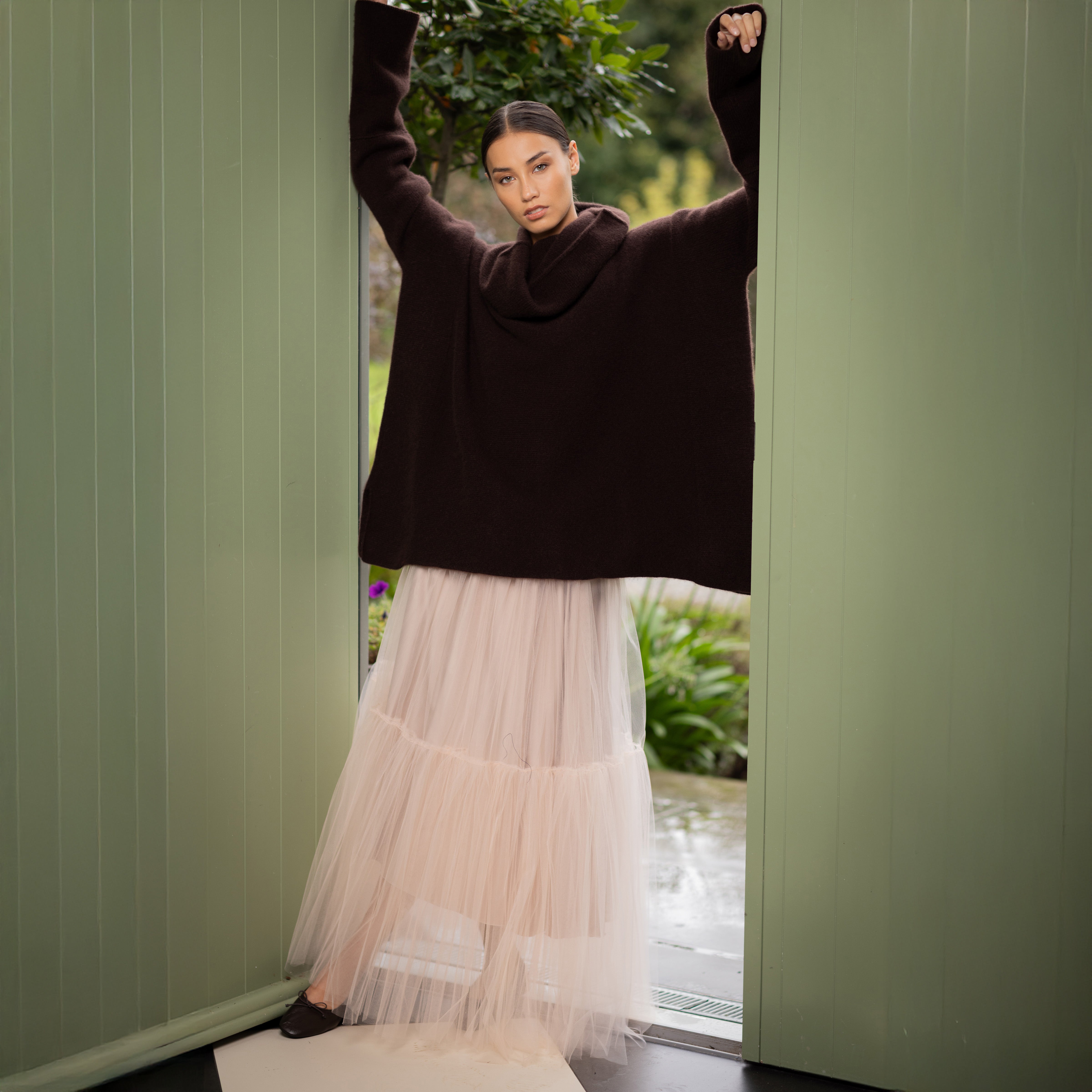 woman wearing an oversized cashmere sweater with cowl neck in dark brown over  pale pink tulle skirt