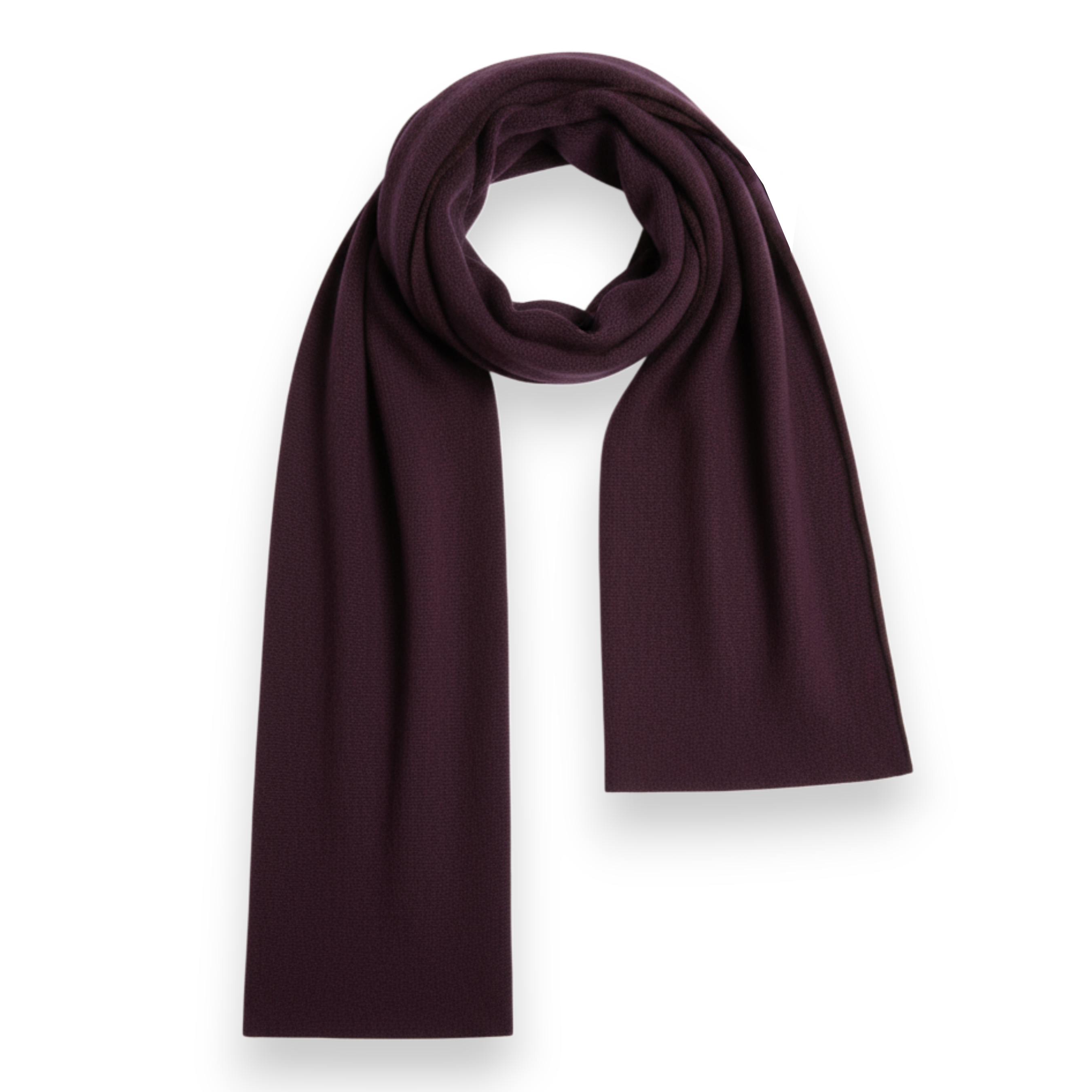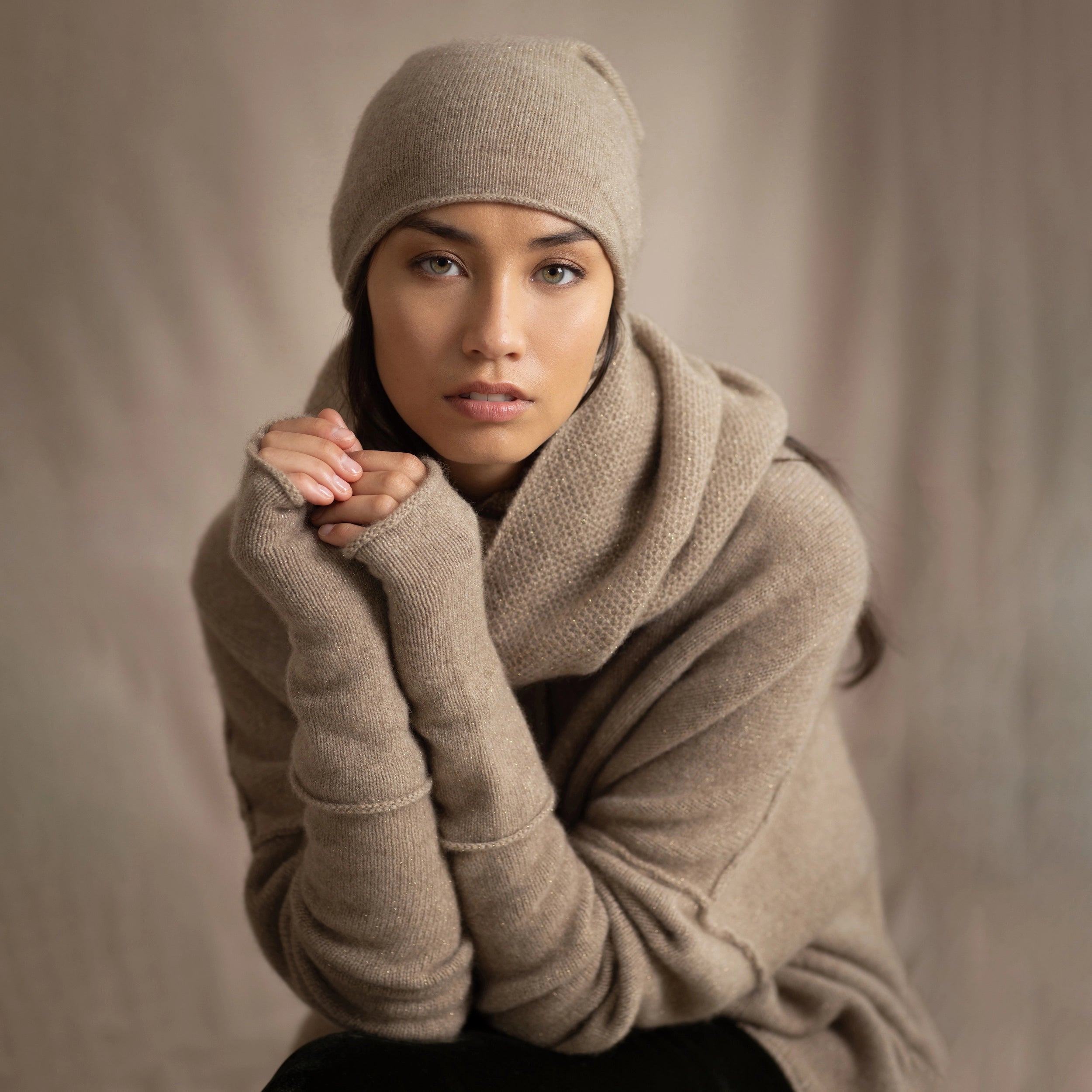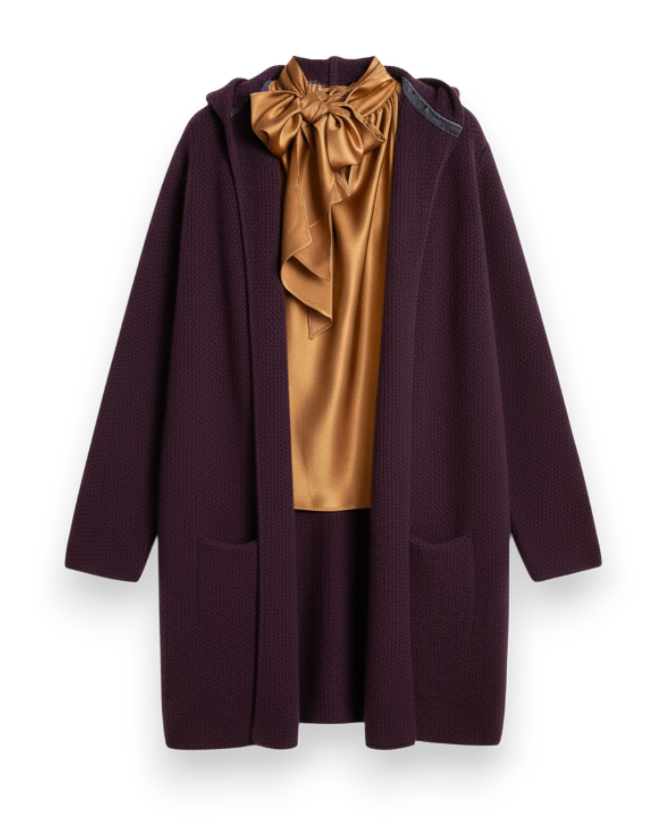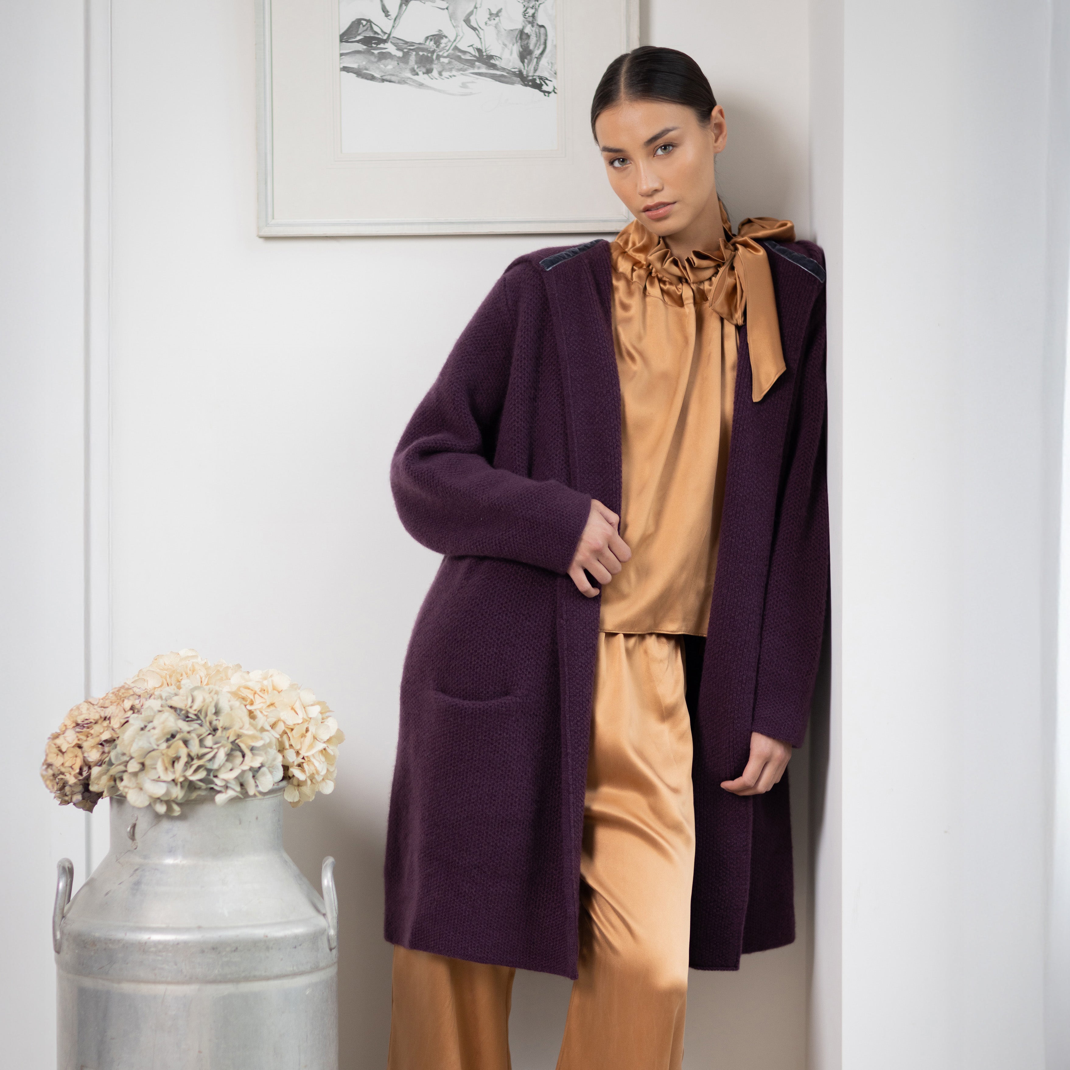 Woman wearing a long purple cashmere coat, bronze silk blouse and silk pants with dark purple cashmere beanie hat