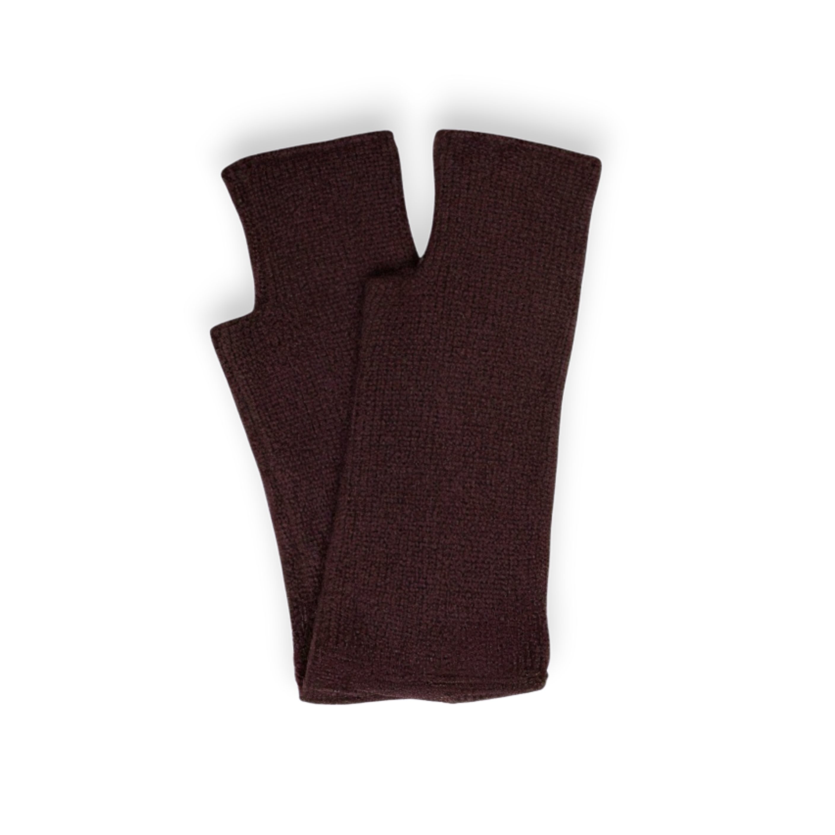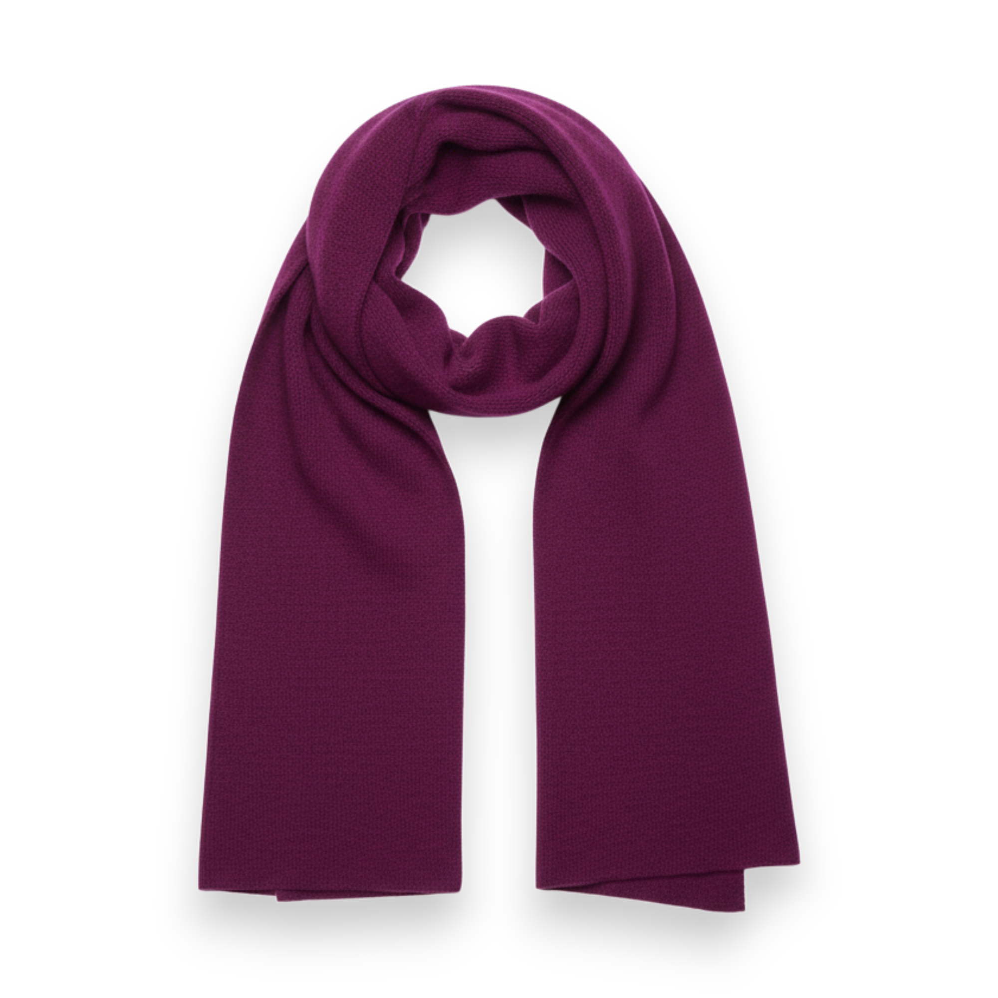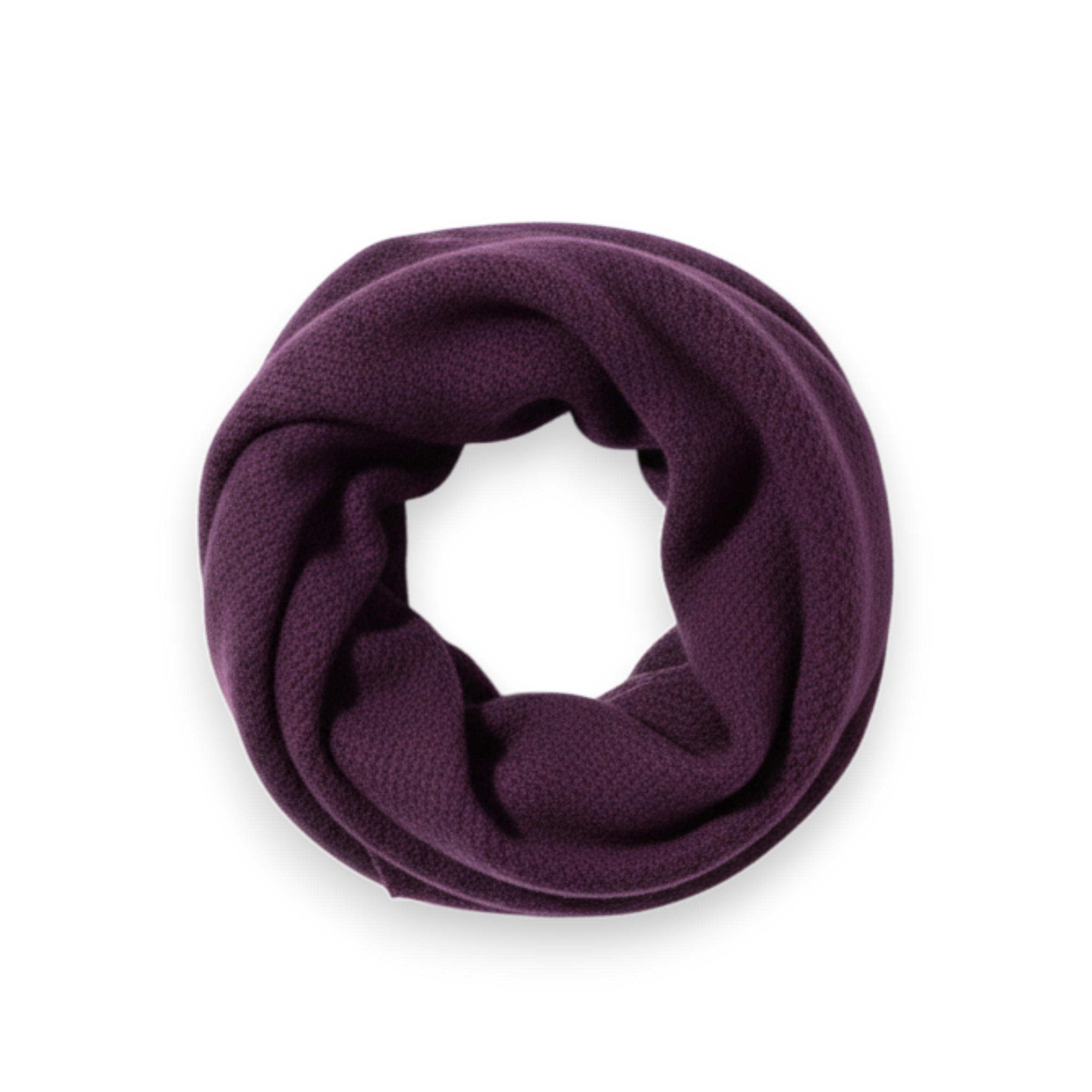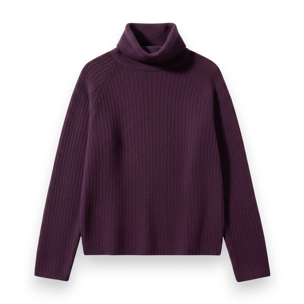 Woman wearing a long purple cashmere coat, bronze silk blouse and silk pants with dark purple cashmere beanie hat