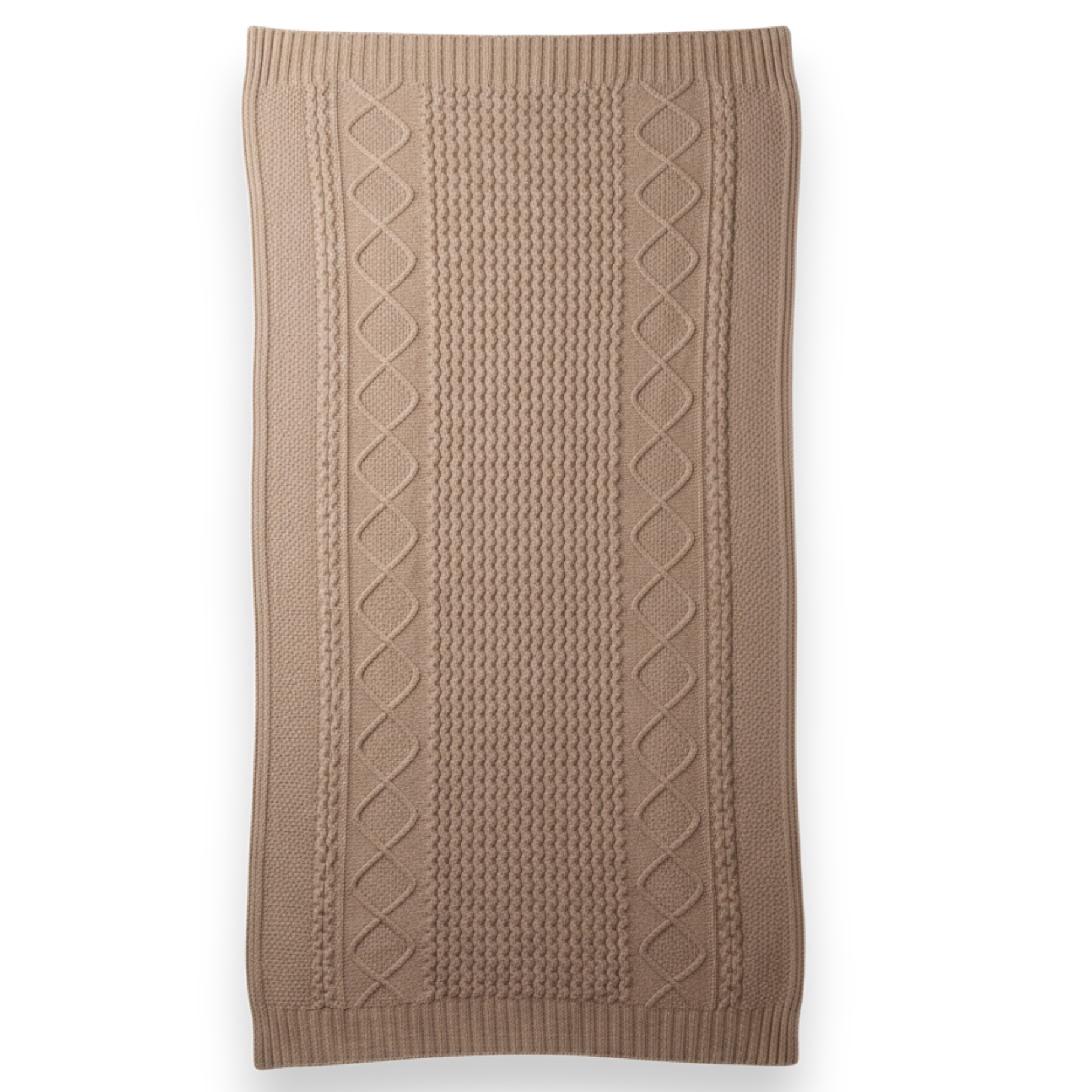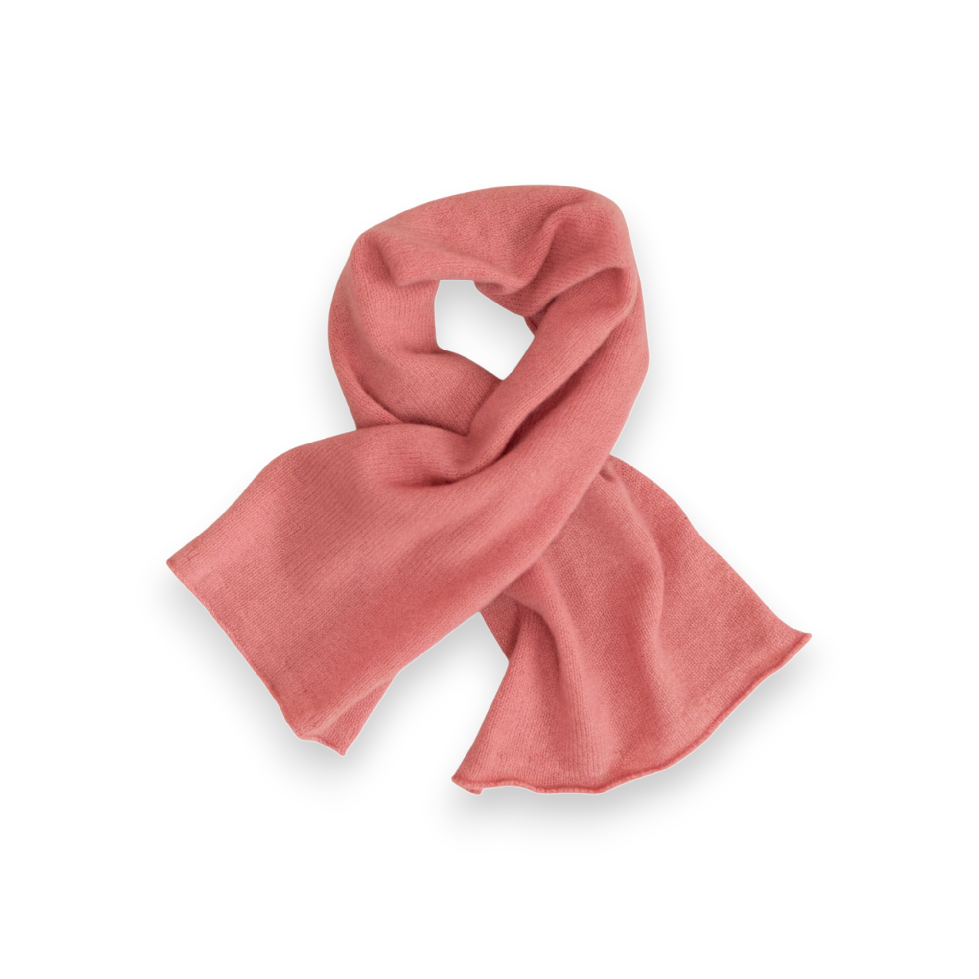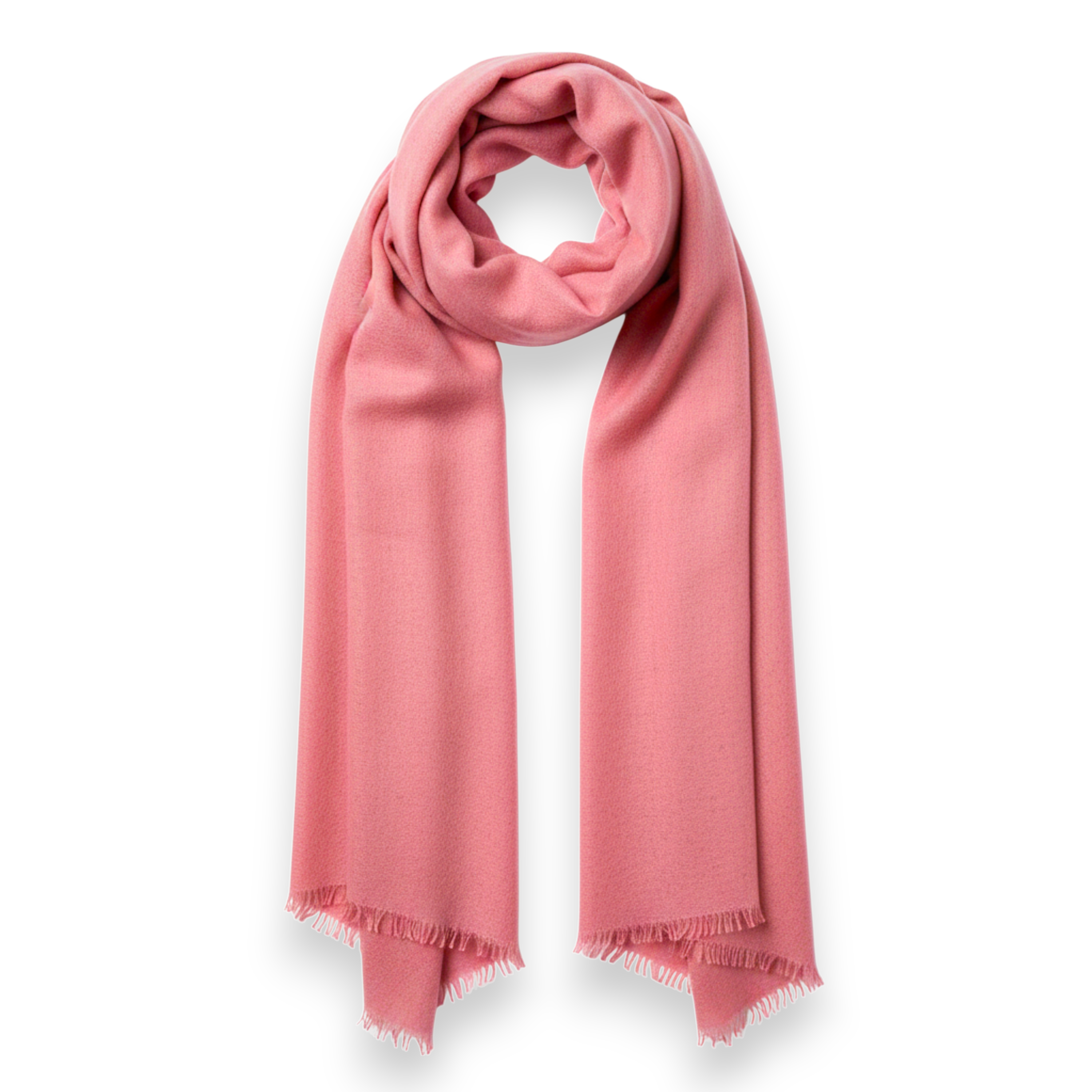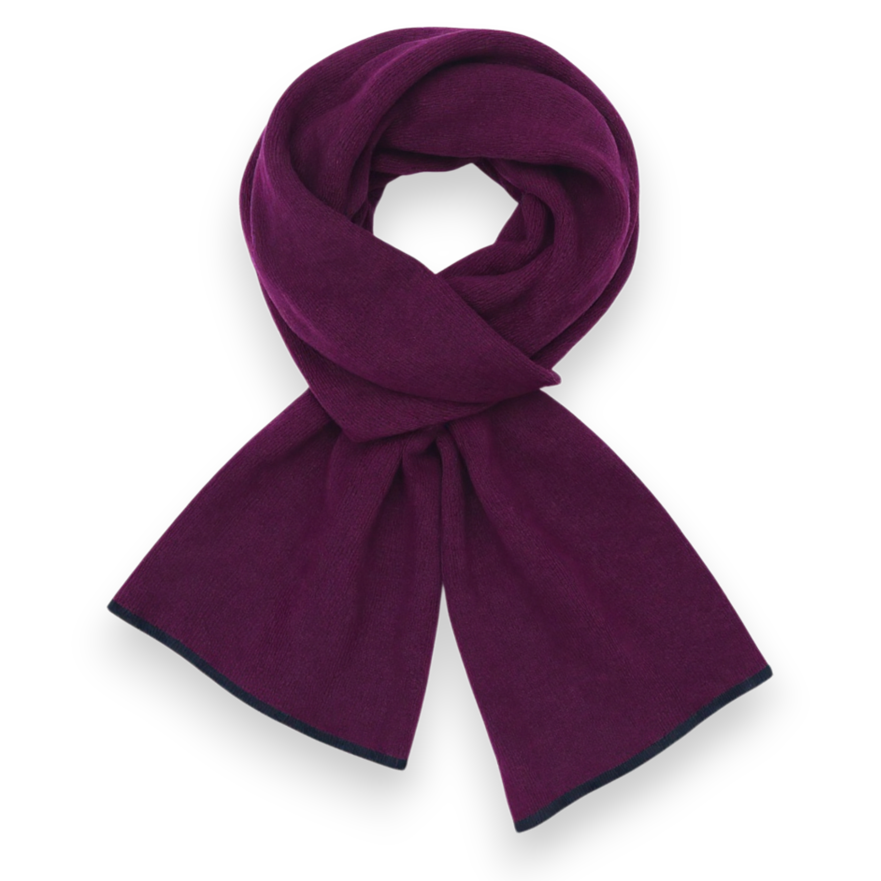 Woman wearing a long purple cashmere coat, bronze silk blouse and silk pants with dark purple cashmere beanie hat