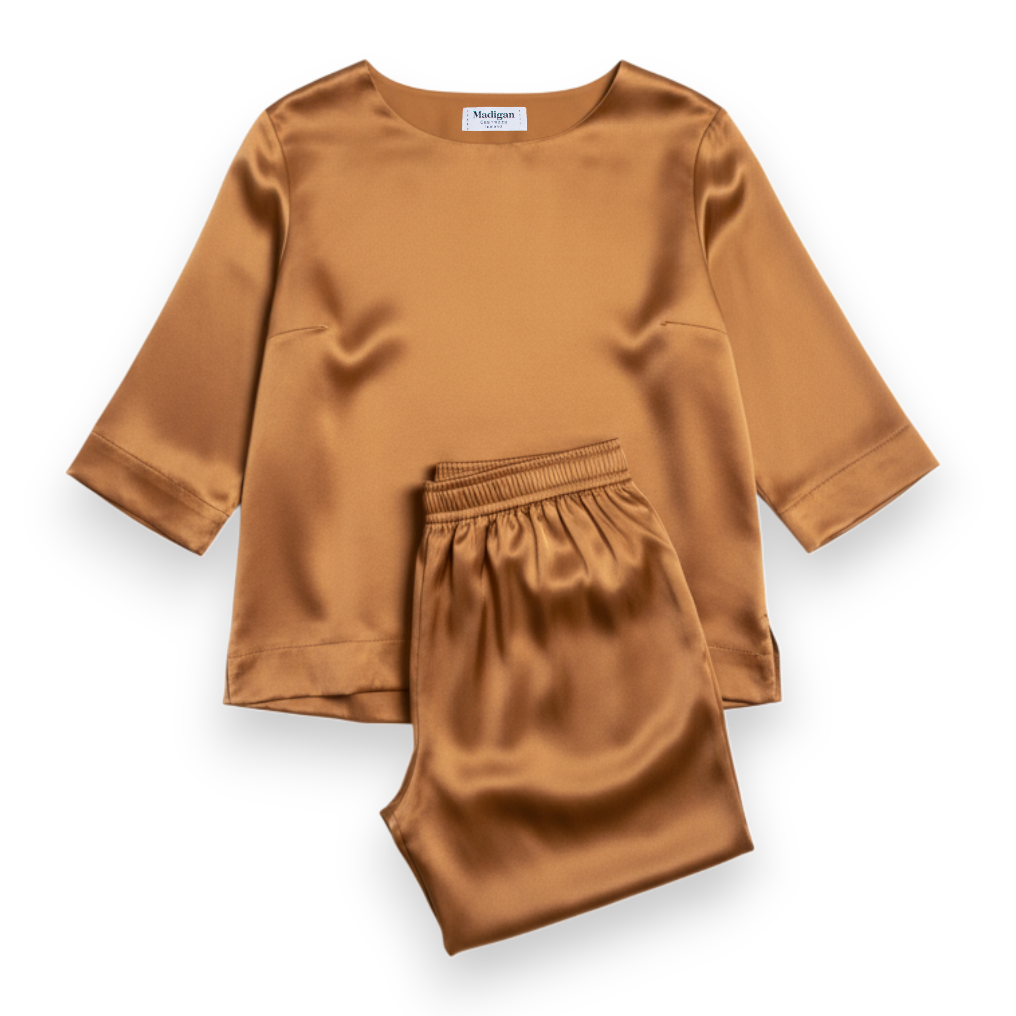 a woman wearing bronze silk trousers and matching halter top  with loafers