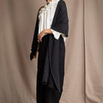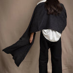 a woman wearing a large sparkling cashmere wrap shawl in black