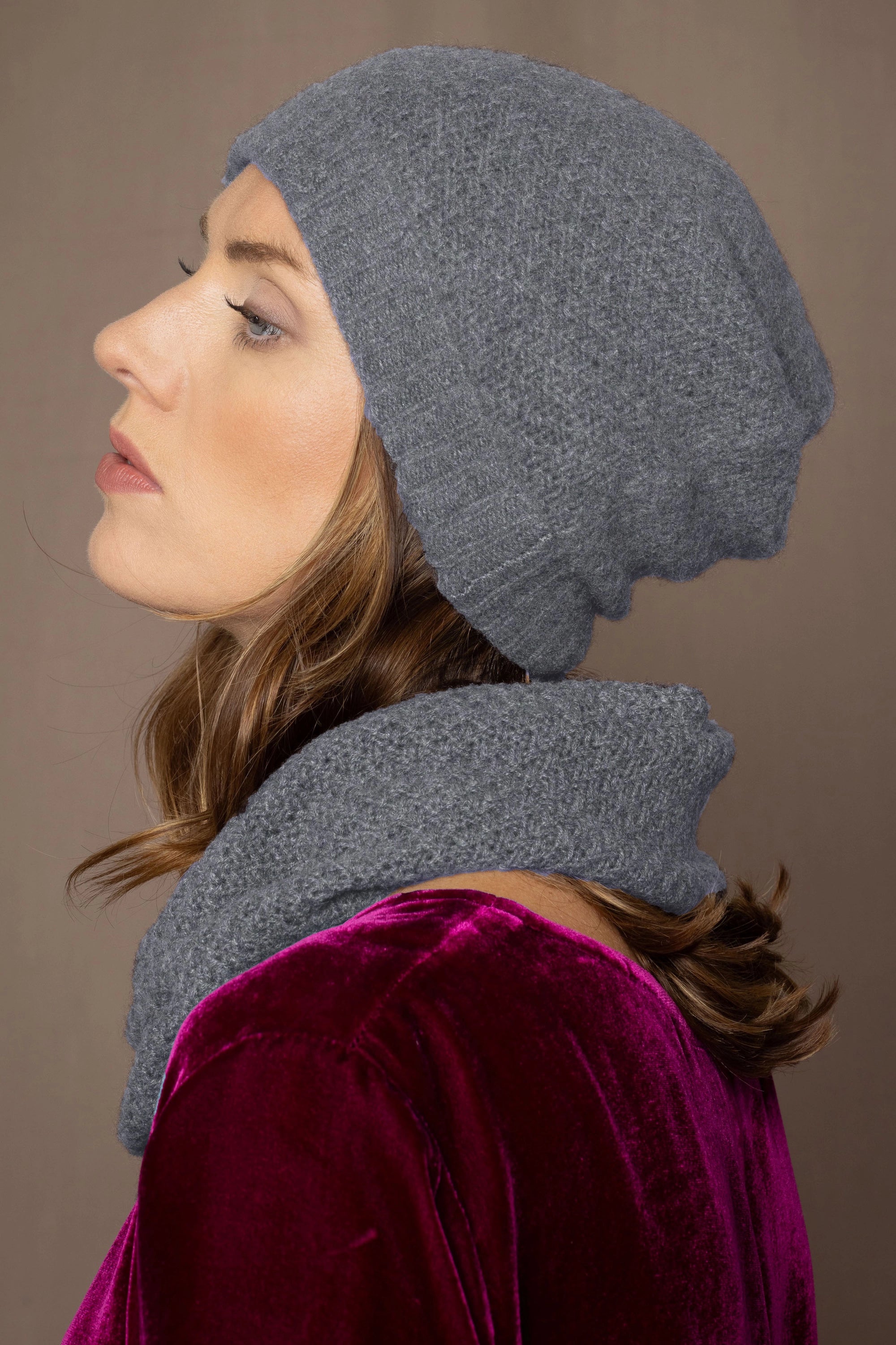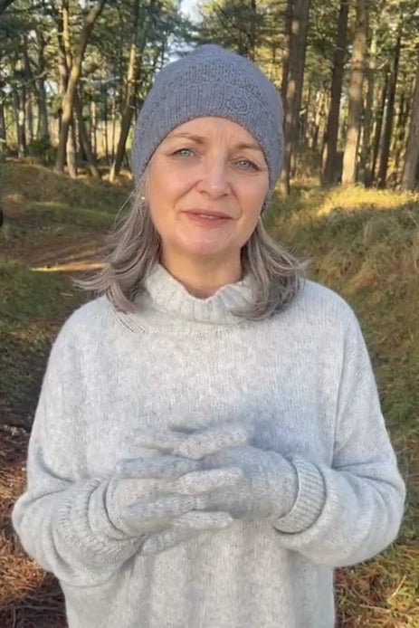 Please note: Heather, Indigo, Vintage Rose, Flannel are made from our pure Cashmere yarn and Bourgeois, Bayleaf, Praline, Tea Rose, Ivory, Clementine & Black are made from our Cashmere & Silk yarn.