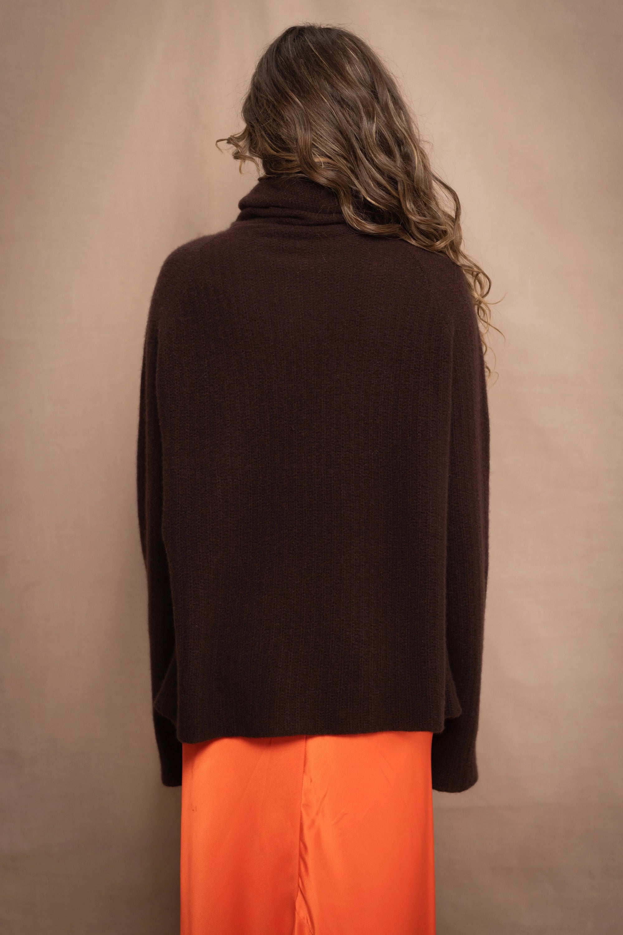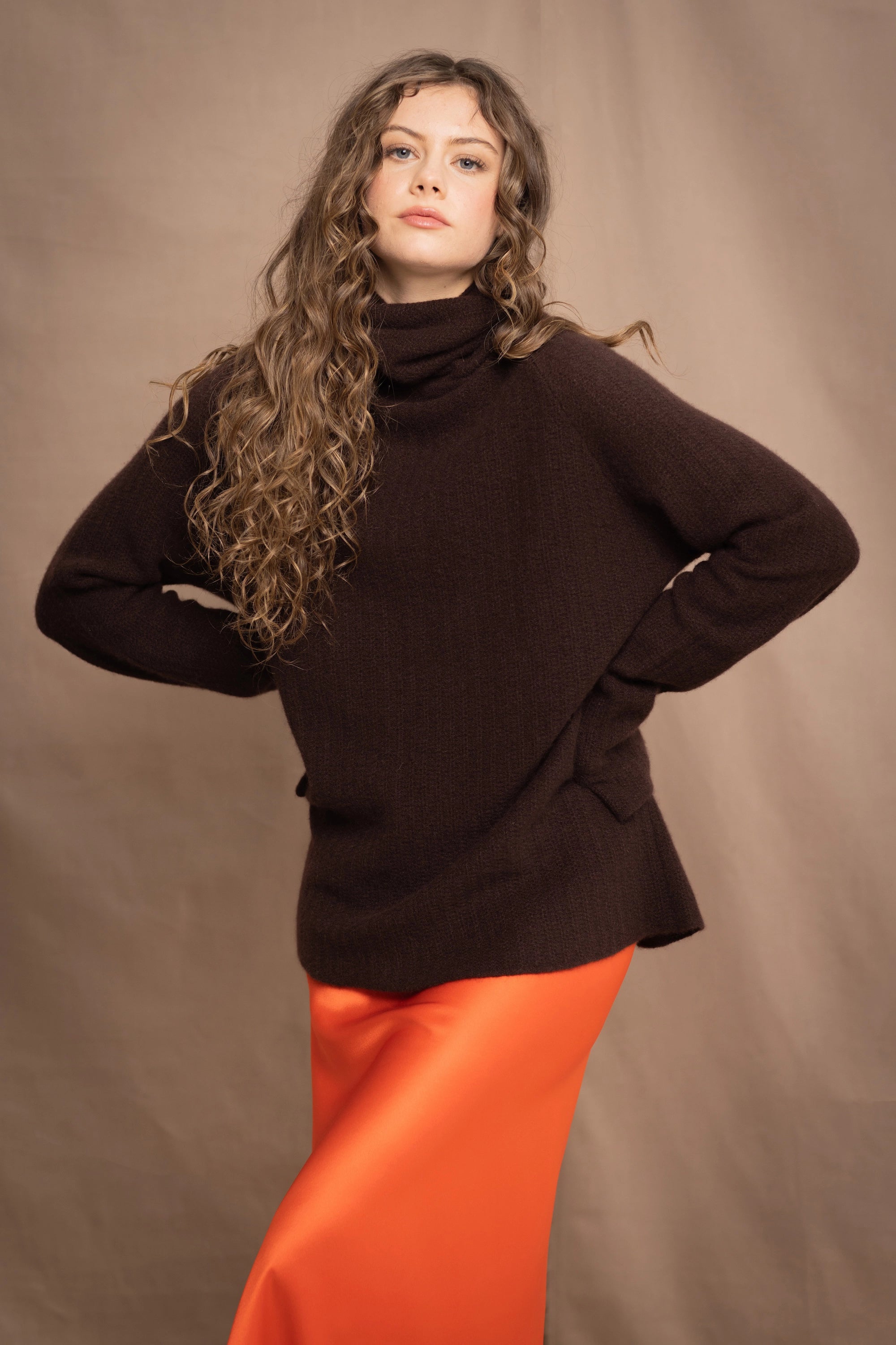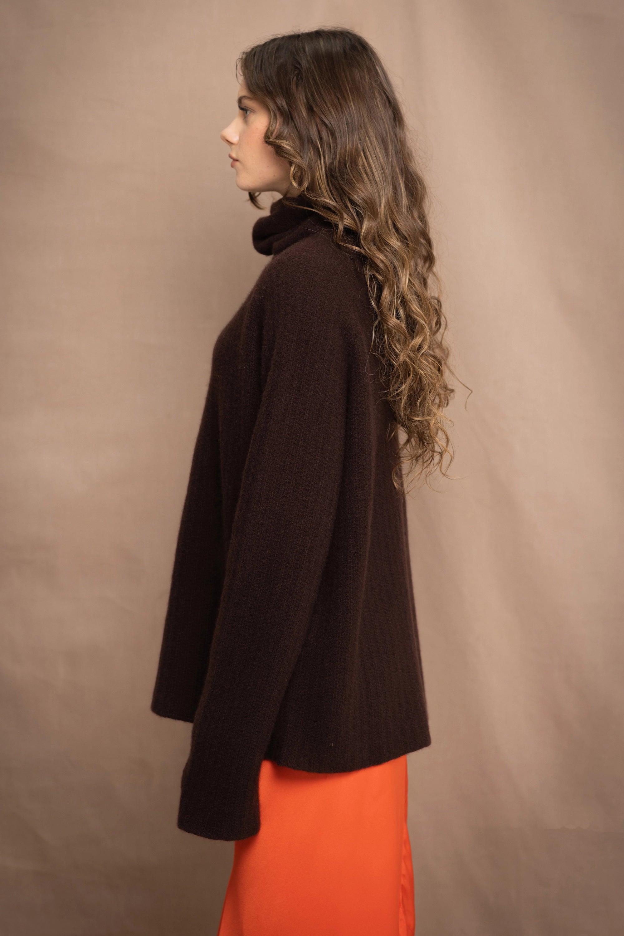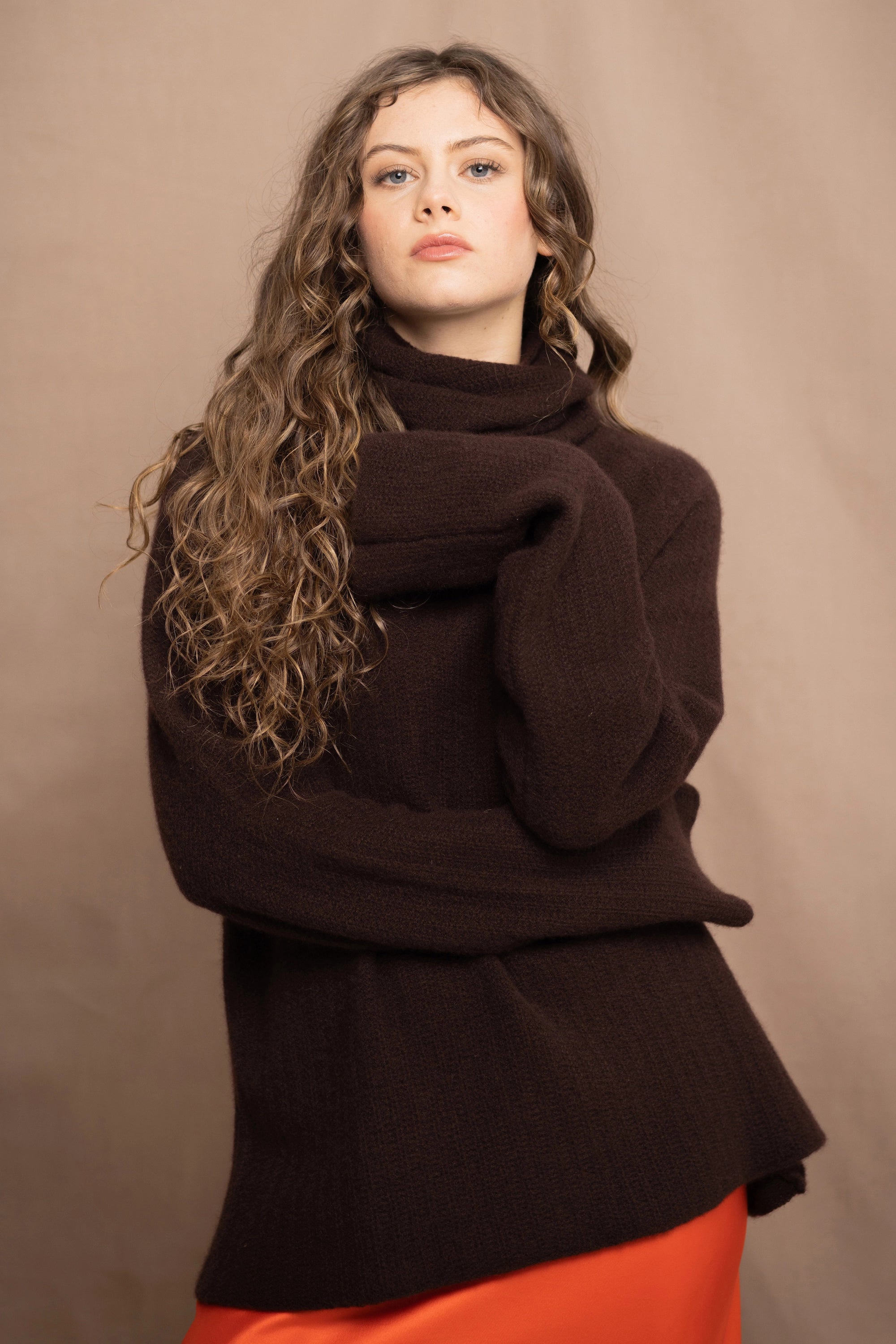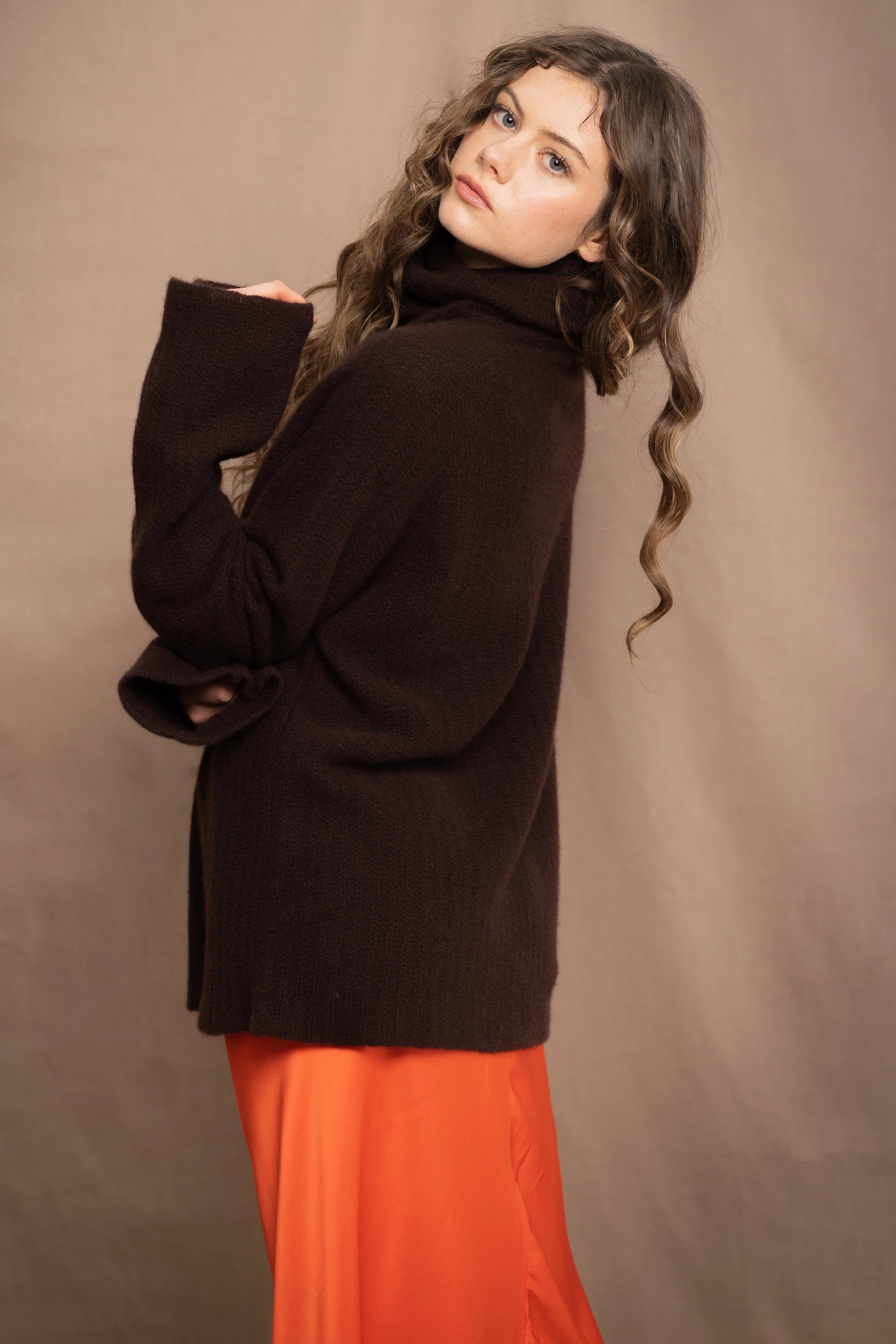 Woman wearing a dark brown fisherman knitted turtleneck sweater  jumper and bronze silk pants