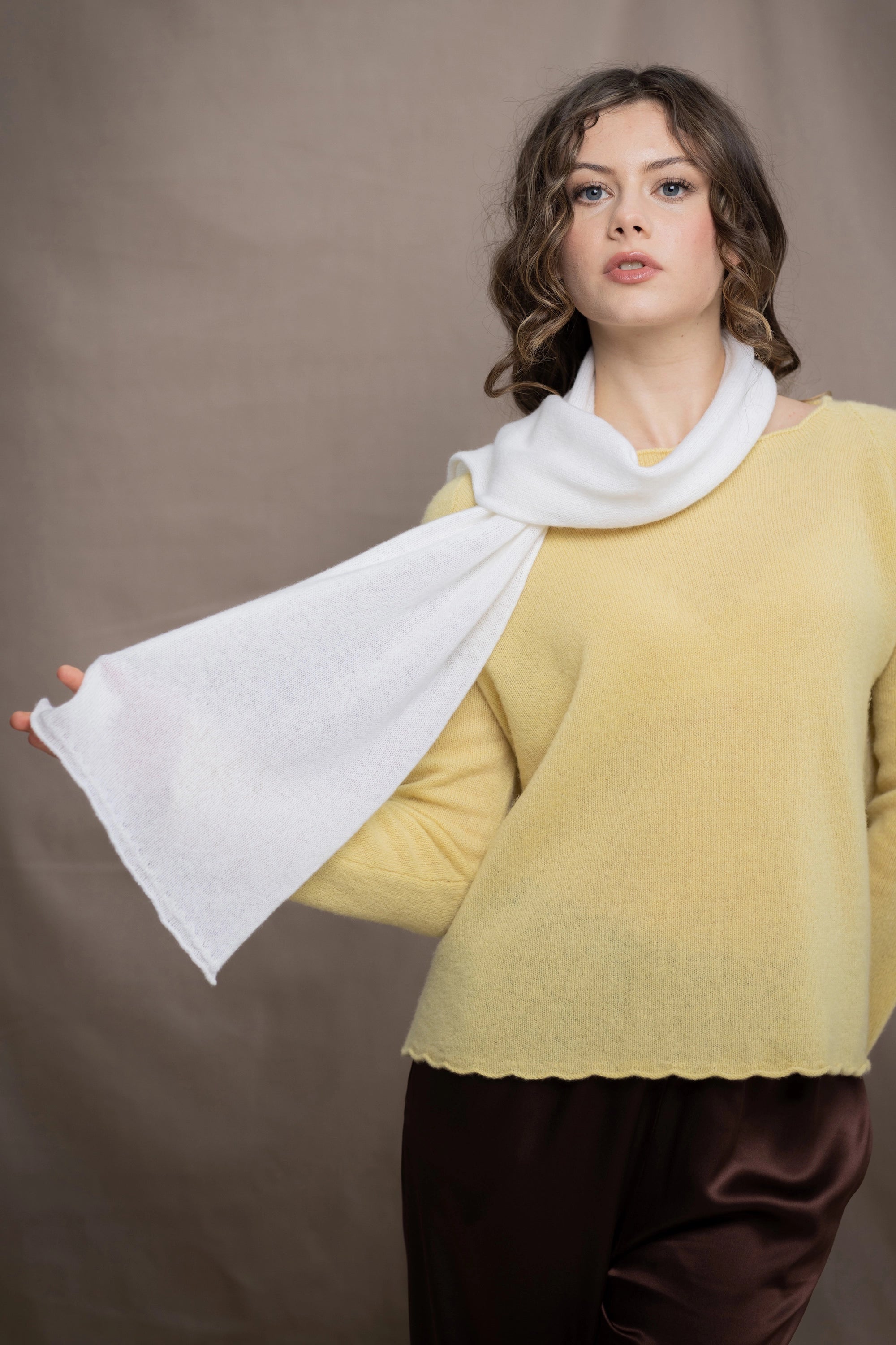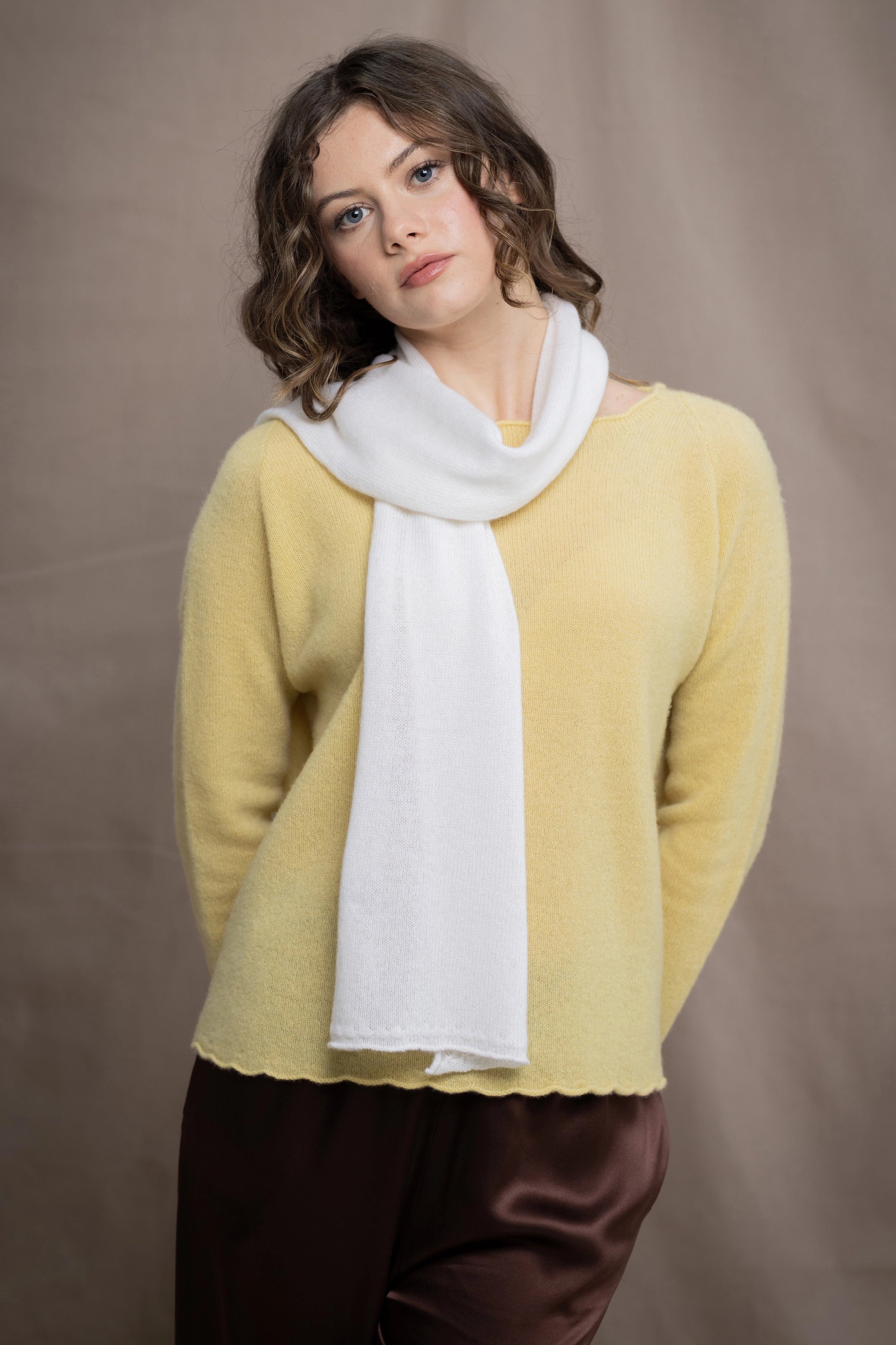 A woman wears a cashmere sweater jumper in pale yellow with scallop trim detail along neck, sleeves and hemline with brown silk trousers and white cashmere scarf on top